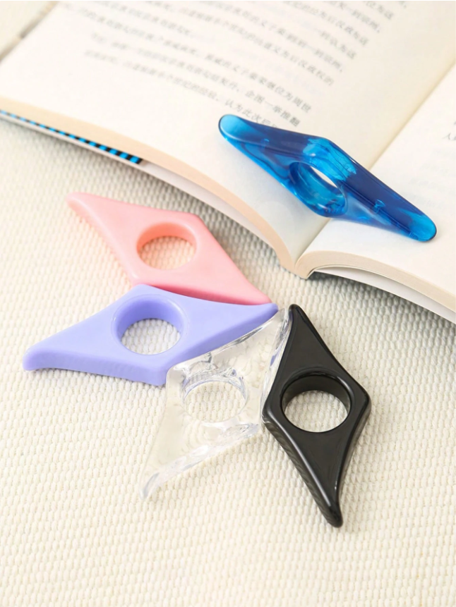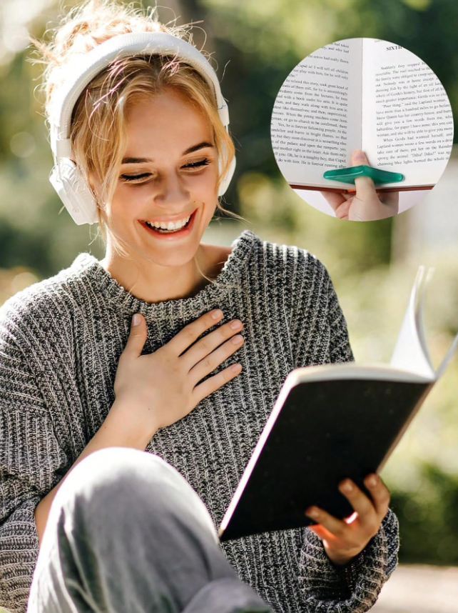 Практичен и удобен аксесоар за четене, който се поставя на палеца и задържа страниците на книгата широко отворени. Идеален за четене с една ръка – вкъщи, в кафене, в метрото или на открито. Подходящ за ученици, студенти и запалени читатели.