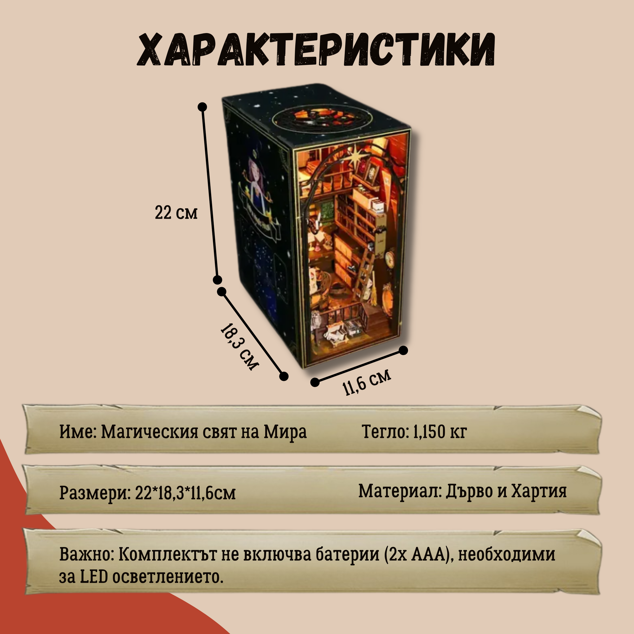 Нашите DIY комплекти съдържат всичко необходимо – подробно ръководство, инструменти за рязане, декоративна хартия, твърди шперплатови елементи и осветление.